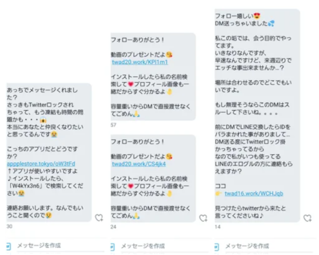 業者の目的はライン、カカオトークに誘導し、釣った裏垢男子のリスト化し、そのリストに対して商品を販売する、他のサイトに誘導することが目的です。